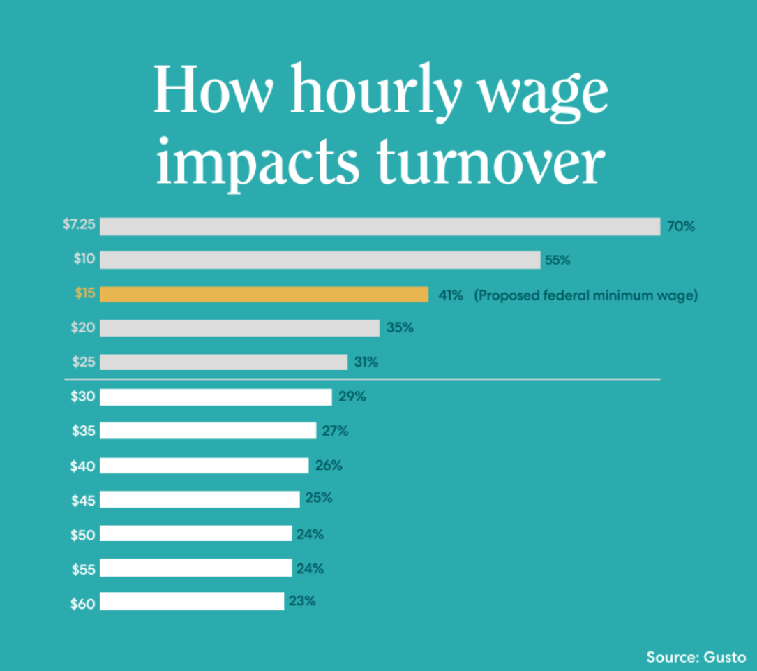 - A higher minimum wage reduces worker turnover by decreasing the incentive for workers to leave the job force or seek higher wages elsewhere. In the status quo, many low-wage workers jump from job to job to see higher wages, or in some instances even leave the workforce entirely because the work is not worth the low pay. This, in turn, harms businesses because they lack workers which requires costs to be spent on hiring advertisement and training new workers. A higher minimum wage would decrease the incentive for workers to quit since they will likely be more comfortable with their wages, reducing turnover rates by almost half.41